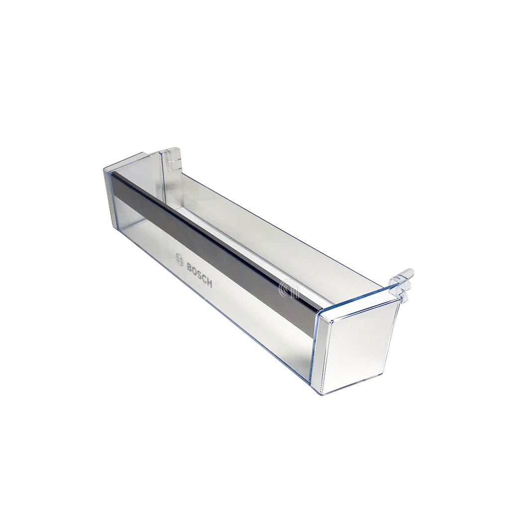Cette pièce de rechange est un balcon ou étagère pour la porte de réfrigérateur, pièce originale Bosch conçue pour maintenir les aliments et les bouteilles bien rangés à l'intérieur de la porte du réfrigérateur.