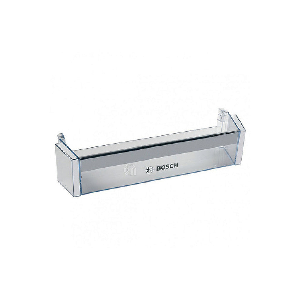 Balconnière ou étagère pour porte de réfrigérateur, conçue pour stocker des bouteilles et autres contenants. Cette pièce de rechange est un composant original Bosch compatible avec les réfrigérateurs de cette marque ainsi que Siemens utilisant le même design.
