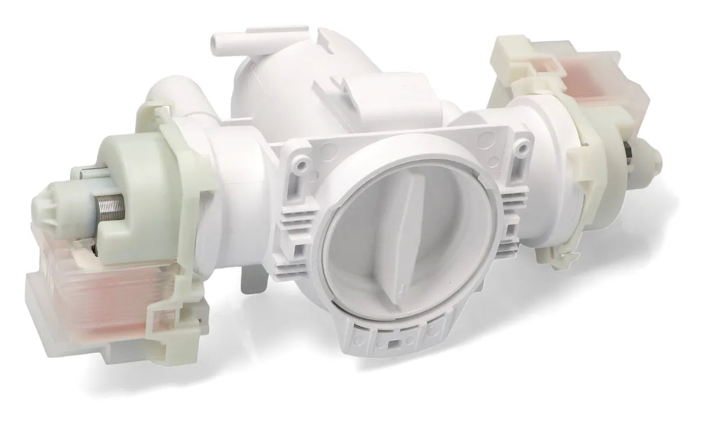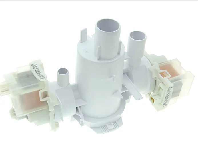 Pompe de lave-linge Fagor, Edesa, Aspes. Avec filtre. Double pompe de vidange et de recyclage. Tuyaux Ø 32, 25 et 16 mm. La pompe du lave-linge tombe en panne lorsqu'elle cesse de vider l'eau ou lorsque l'appareil électroménager s'arrête pendant le lavage en phase de vidange. Parfois, cette panne est précédée d'un bruit étrange lors de la vidange de l'eau de l'appareil électroménager. Vérifiez régulièrement l'état du filtre pour éviter les pannes.