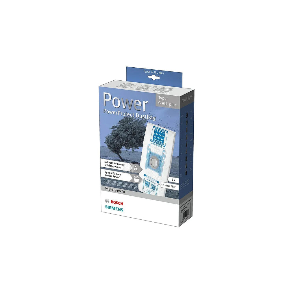 Sac d'aspirateur de type G All Plus compatible avec les aspirateurs des marques Bosch, Siemens et Profilo. Cette pièce de rechange est essentielle pour recueillir la poussière et la saleté pendant l'utilisation, offrant une capacité 60 % supérieure aux sacs standards, ce qui permet une plus grande durée d'utilisation entre les changements.