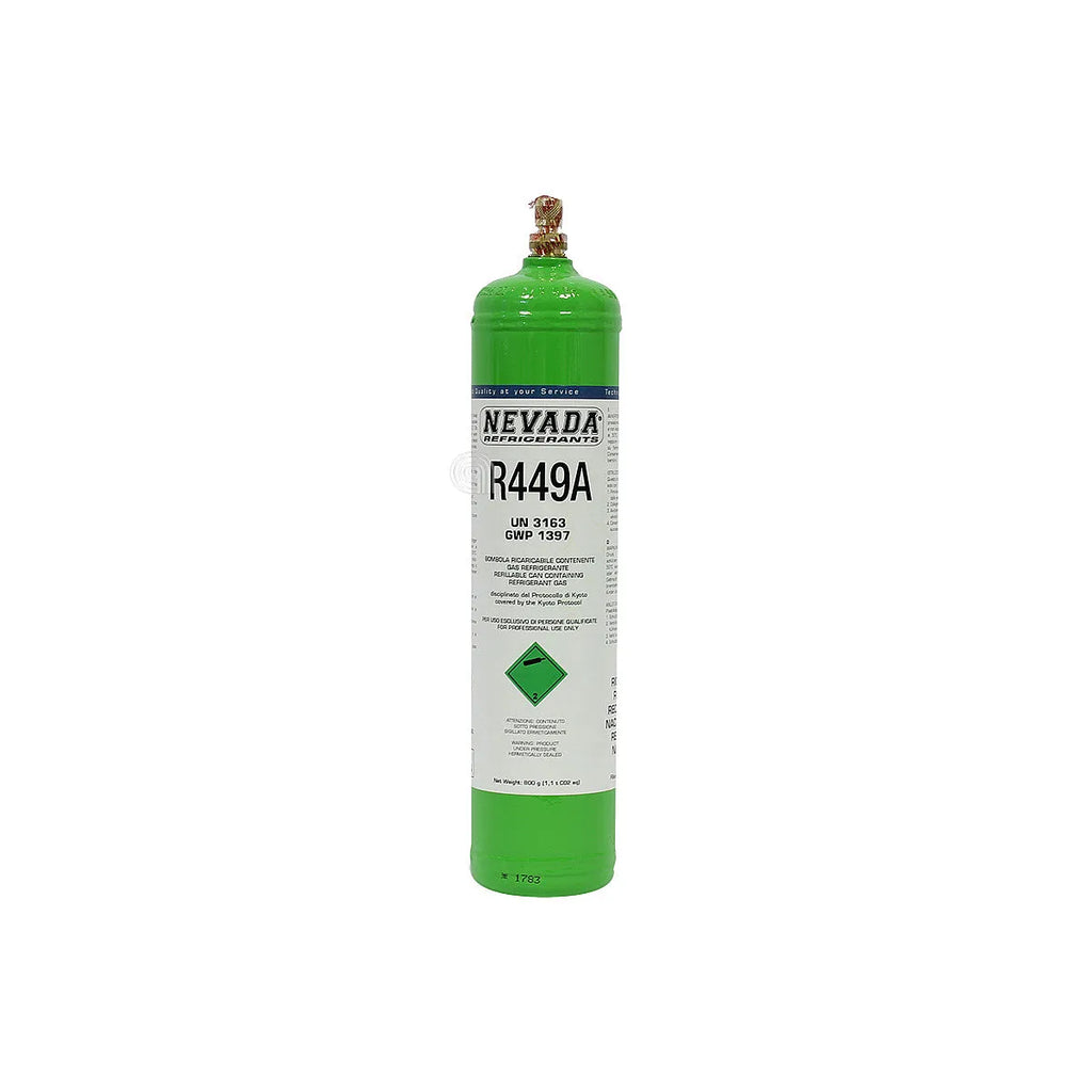 UNIVERSALE, Adaptable. Le R-448A est un fluide frigorigène HFO non inflammable à faible PRP, conçu pour remplacer le R-404A et le R-507 dans les systèmes de réfrigération à basse et moyenne température. C’est un mélange zéotropique de HFC et HFO, offrant une excellente efficacité énergétique et un moindre impact sur l’environnement. Il est idéal pour les supermarchés et les systèmes de réfrigération commerciale, tant pour les installations neuves que pour les remises à niveau. Sa composition comprend le difluorométhane (HFC R32), le pentafluoroéthane (HFC R125), le 1,1,1,2-tétrafluoroéthane (HFC R134a), le 2,3,3,3-tétrafluoroprop-1-ène (HFO R1234yf) et le trans-1,3,3,3-tétrafluoroprop-1-ène (HFO R1234ze).