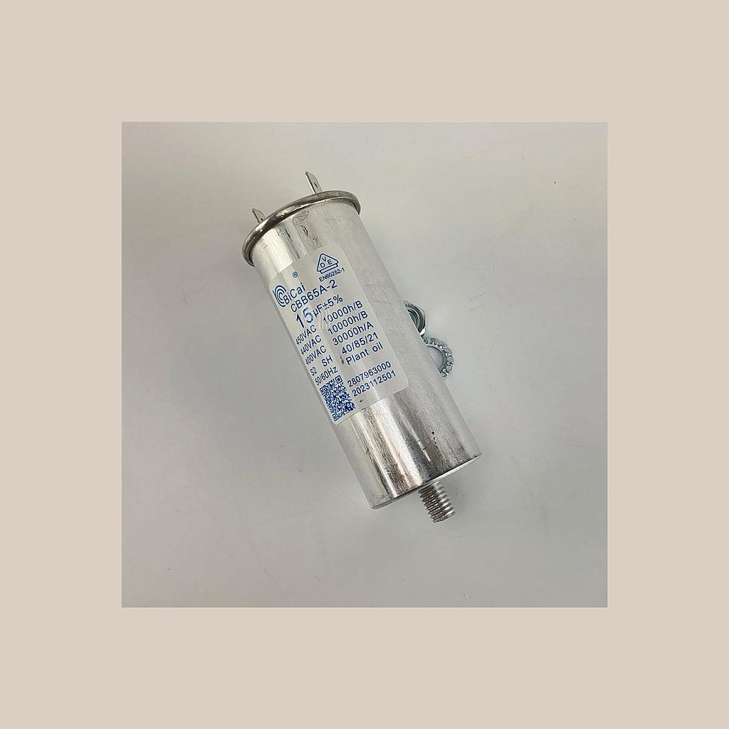 Condensateur Bicai de 15 microfarads (15 µF) conçu pour sèche-linge. C’est une pièce essentielle pour le démarrage correct et le fonctionnement du moteur de l’appareil électroménager.