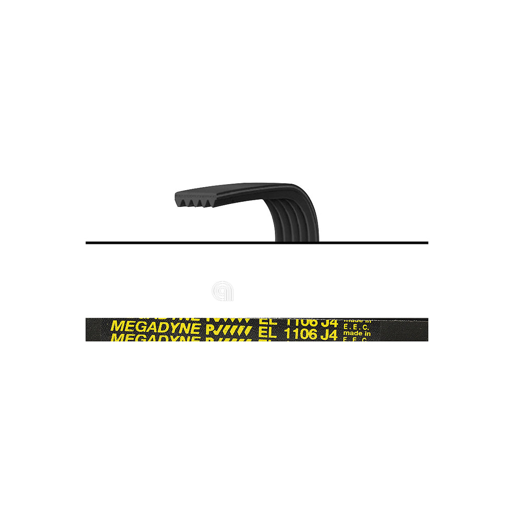 Courroie Poly-V J4 1106 EL d'origine pour lave-linge, conçue pour transmettre le mouvement du moteur au tambour, assurant un fonctionnement optimal de l'appareil électroménager.