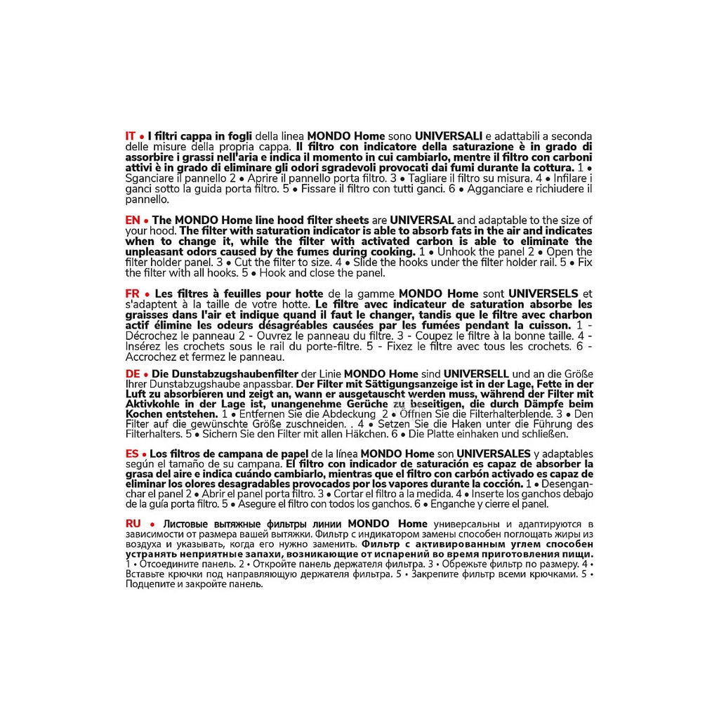 Ce filtre est compatible avec les hottes aspirantes de la marque Mondo, en particulier les modèles utilisant le code de référence 00701024. De plus, il peut être compatible avec d’autres modèles universels de hottes nécessitant des filtres à graisse et à charbon actif de taille 45x90 cm.