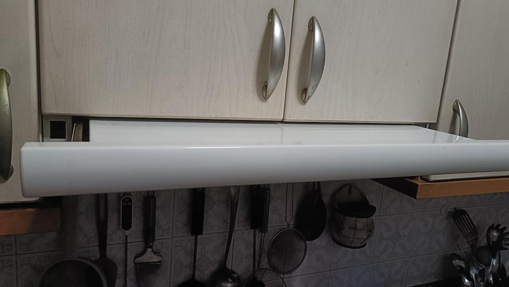 Cette façade est blanche et les vis y sont vissées pour pouvoir retirer la façade de la hotte aspirante.