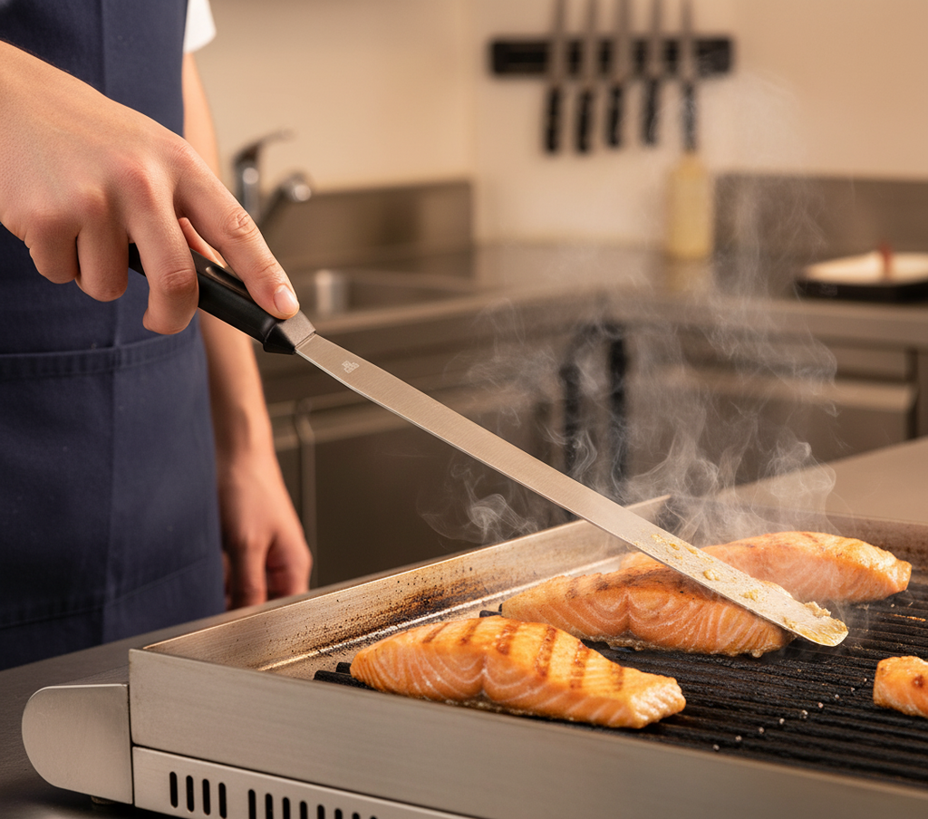 Son design avec manche solide intégré procure un équilibre parfait et une robustesse supérieure par rapport aux spatules avec manche en plastique ou en bois. Idéal pour travailler avec des aliments chauds, des préparations délicates et un usage intensif dans des cuisines professionnelles ou domestiques exigeantes.