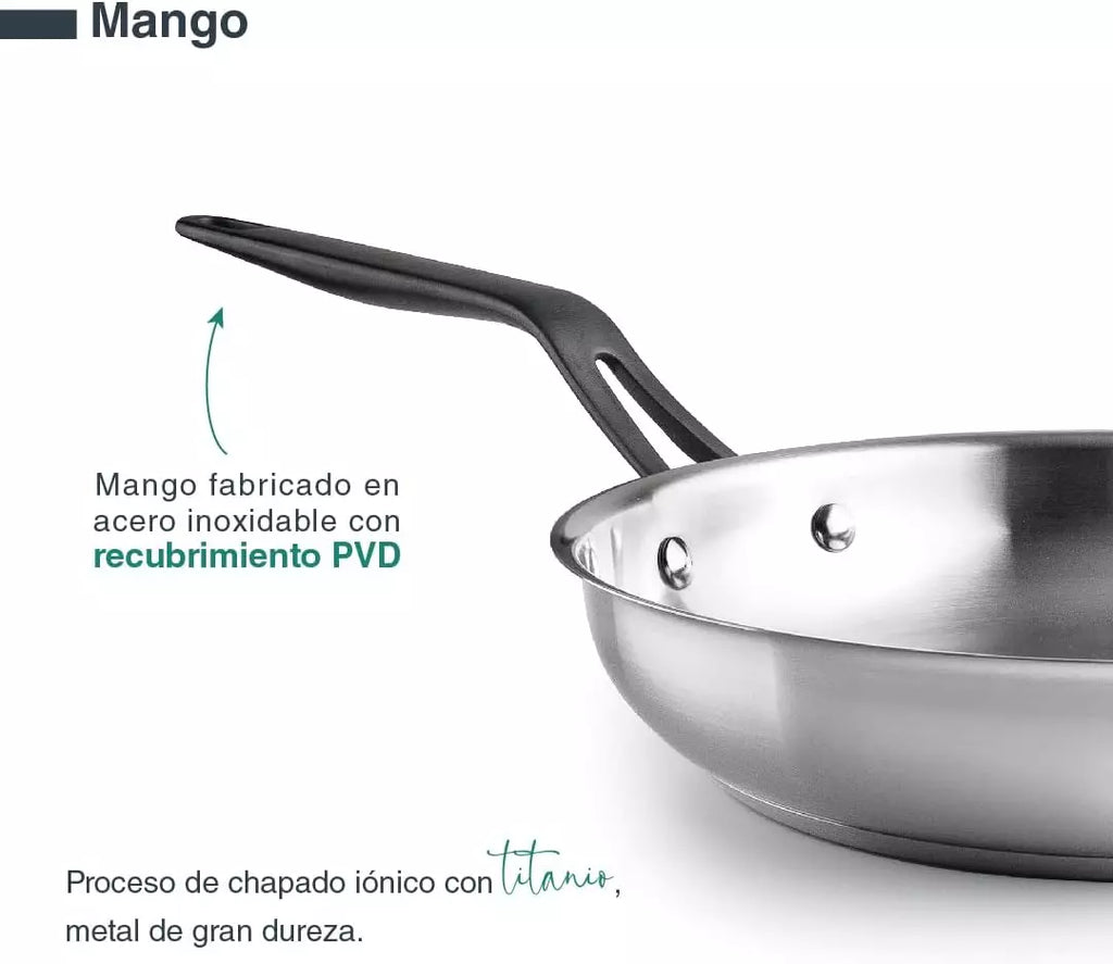 Cette poêle en acier inoxydable 18/10 est l'accessoire parfait pour cuisiner avec une qualité maximale. Sa construction avec fond thermodiffuseur sandwich garantit une répartition rapide et uniforme de la chaleur.