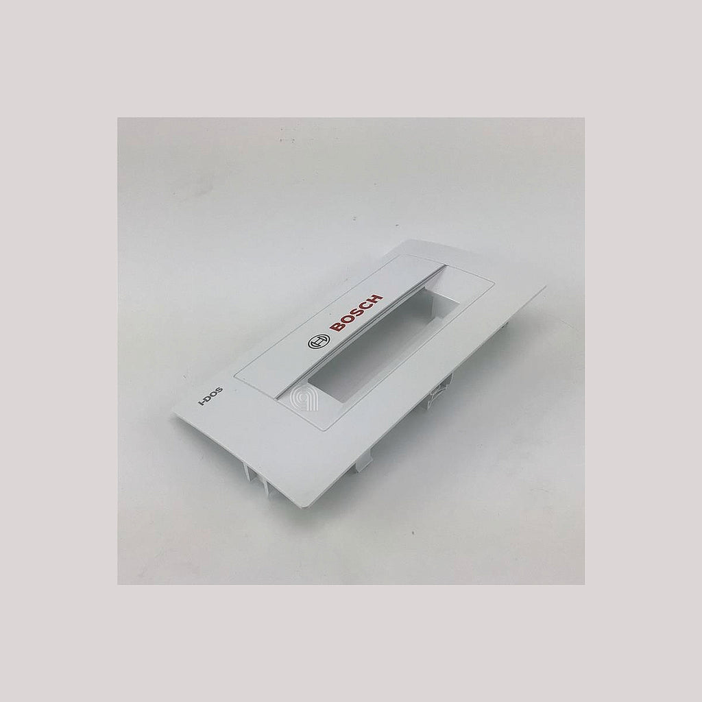 Cette poignée pour tiroir à détergent est une pièce de rechange d'origine Bosch conçue pour les lave-linges. Elle sert à ouvrir et fermer le compartiment où sont déposés le détergent et autres produits de lavage, garantissant une utilisation confortable et fonctionnelle de l'appareil.