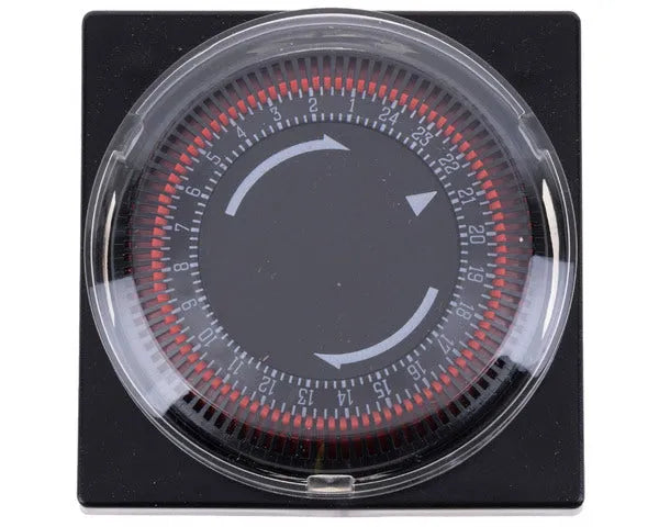 Ce programmateur horaire analogique DCR24H est conçu pour le contrôle automatique des appareils électriques, notamment dans les chambres froides de restauration. Il permet de programmer jusqu'à 24 cycles de mise en marche/arrêt au cours d'une journée, avec des intervalles de 15 minutes, ce qui facilite un réglage précis des temps de dégivrage.