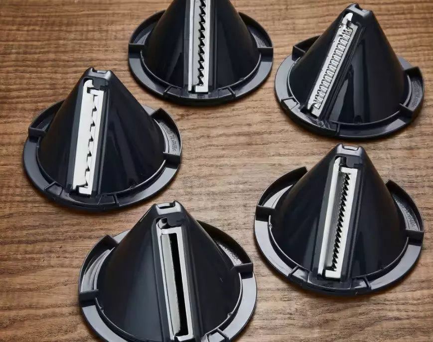 Cet accessoire polyvalent comprend cinq lames en acier inoxydable faciles à régler qui vous permettent de créer différentes formes de pâtes végétales :