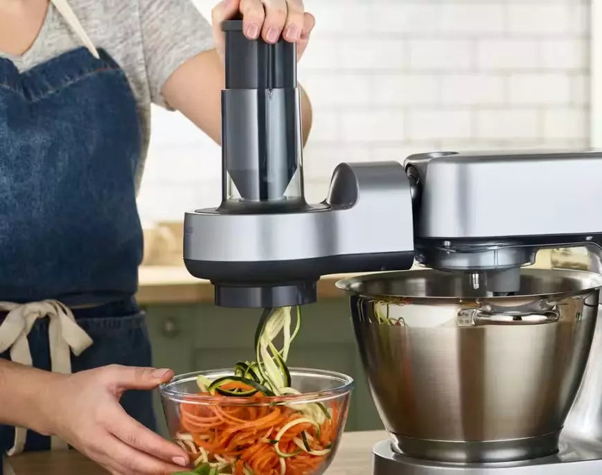 Pièce d'origine Kenwood - Accessoire pour découpe en spirale KAX700PL. Outil professionnel qui transforme les légumes en délicieux nouilles saines avec cinq lames interchangeables en acier inoxydable.