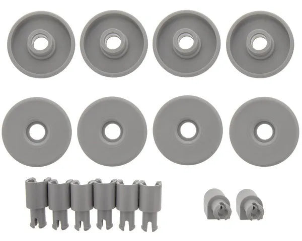 Kit de roues avec support de fixation pour panier inférieur de lave-vaisselle. Comprend 8 roues. Codes originaux : 50286965004 (GRIS) et 50269971003 (BLANC). Ces roues sont conçues spécifiquement pour le panier inférieur de lave-vaisselle, avec un diamètre : 40 mm. hauteur : 8 mm. couleur : gris. matériau : plastique..