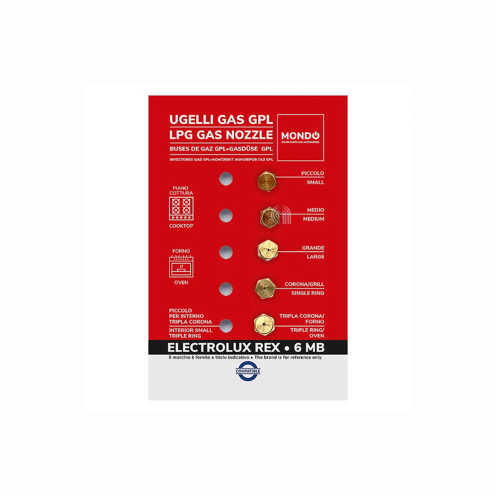 Jeu de 5 injecteurs de gaz GPL (gaz butane/propane) pour plaques de cuisson des marques ELECTROLUX, ZANUSSI, UNIVERSALE, MONDO. Ce kit adaptable est idéal pour la conversion de votre cuisinière au gaz de pétrole liquéfié, garantissant un fonctionnement sûr et efficace. Compatible avec une large gamme de modèles de plaques de cuisson.