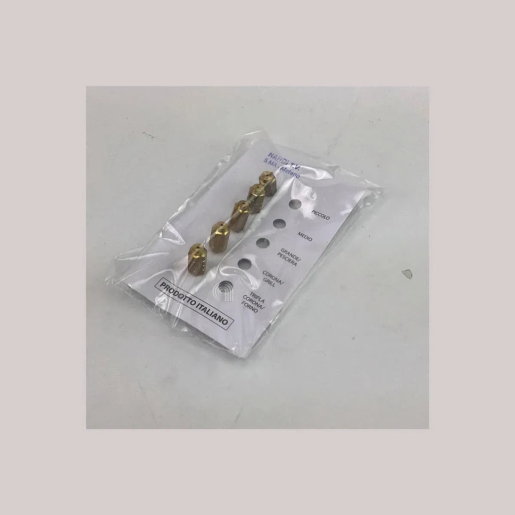 Ensemble d'injecteurs pour gaz naturel (méthane) modèle 5MA, original de la marque Ricambi Cucina. Conçu pour les cuisinières à gaz, cet ensemble permet de réguler le débit de gaz vers les brûleurs, assurant une combustion optimale et sécurisée.